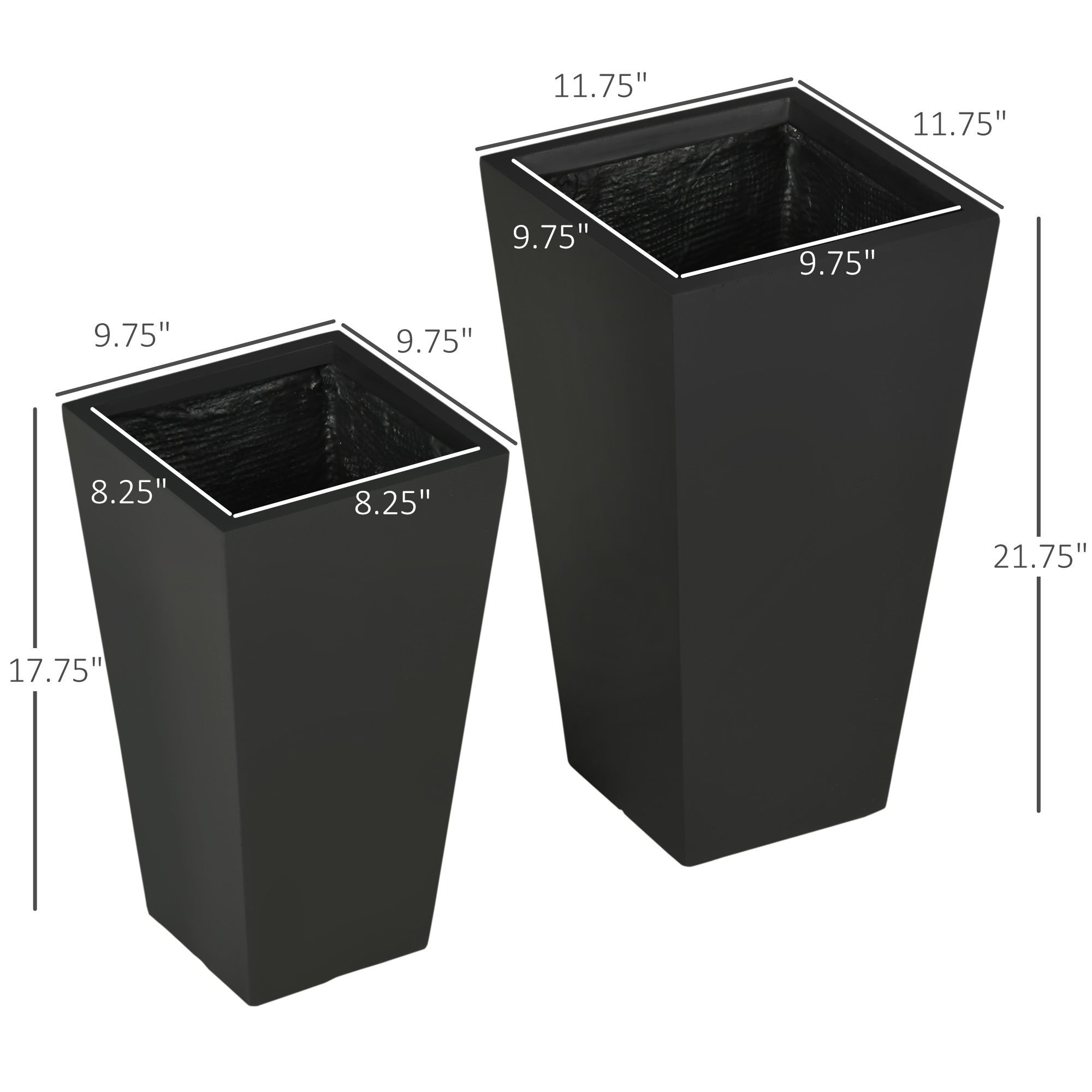 5.- Set of 2 Outdoor Planters Info: Larger Planter Dimensions: 11.75" L x 11.75" W x 21.75" H. Smaller Planter Dimensions: 9.75" L x 9.75" W x 17.75" H. Weight Capacity: 220 lbs., 154 lbs. No assembly required. No inserts in the planters.