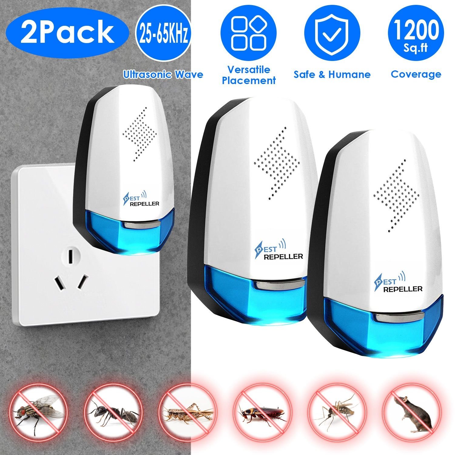 2 Pack Ultrasonic Pest Repeller - 25 - 65KHz Variable Frequency, Covers 1200 Sq.ft Each, Indoor Use for Kitchen, Living Room, Bedroom