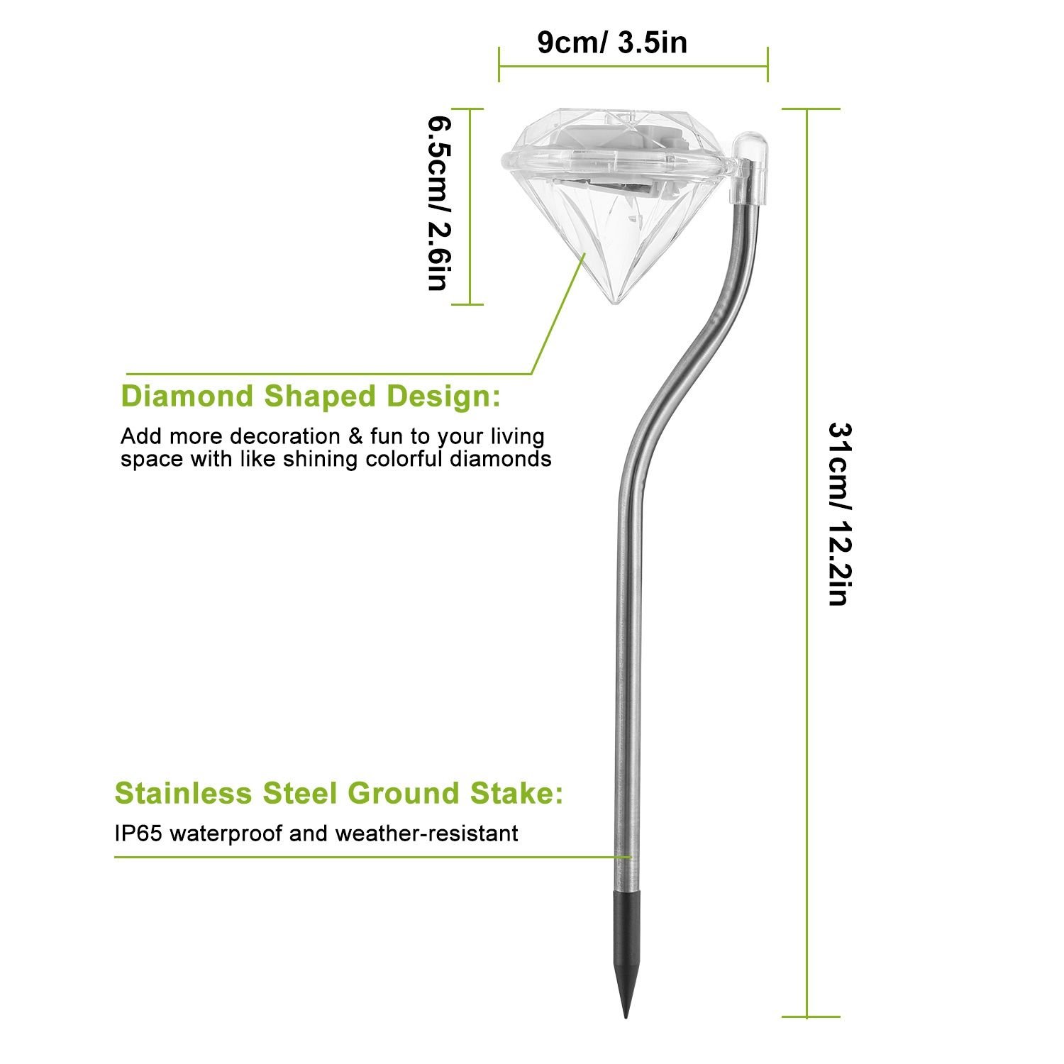 1.EXQUISITE DIAMOND SOLAR GARDEN LIGHTS: Come with 4 pack of diamond solar garden lights, their diamond lampshades are made of quality clear plastic, which have superior charming performance & 7-color auto changing function to light and decorate your garden, front lawn, flowerbed, pathway, walkway, driveway, etc..