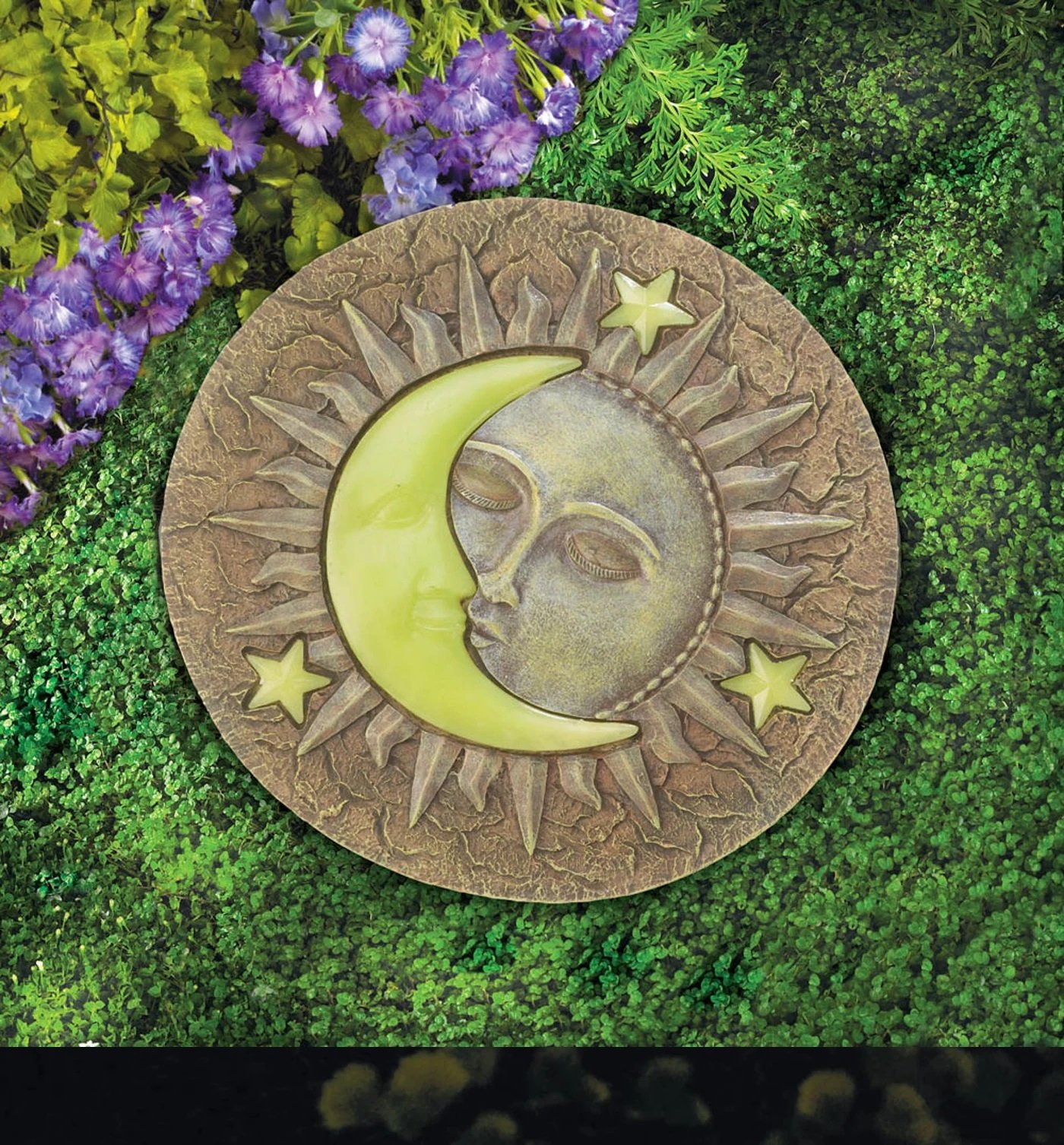 • The sun and moon, together in harmony, are both a welcome presence in your garden or yard. This cool polyresin stepping stone features the sun and a yellow crescent moon, along with a few yellow stars. The moon and stars will glow at night after soaking up some sunlight during the day.
