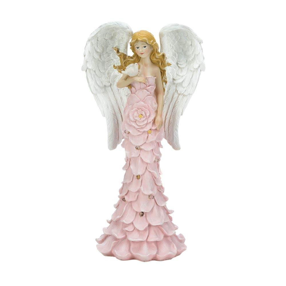 • Add a calming presence to your outdoor space with this charming angel garden statue. This beautiful garden angel features a solar powered design that illuminates the pink rose dress and the bird at night.
