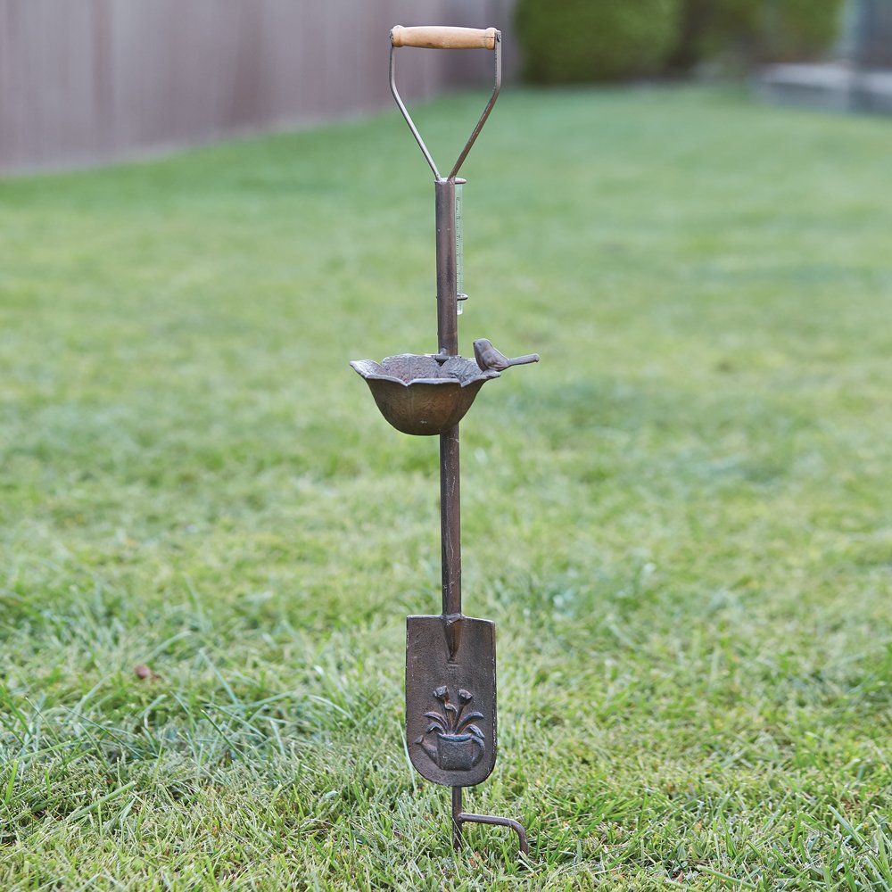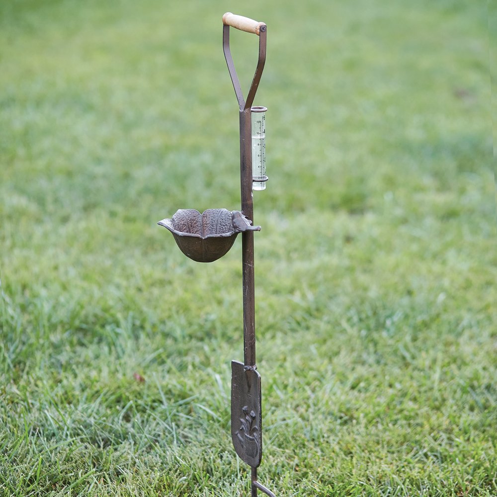 This garden stake provides an all-in-one experience with its rain gauge, feeder, and decorative spade. Perfect for an entrance to a garden or front yard. The glass gauge measures up to 5'' of water. The stake and feeder are made of cast iron.