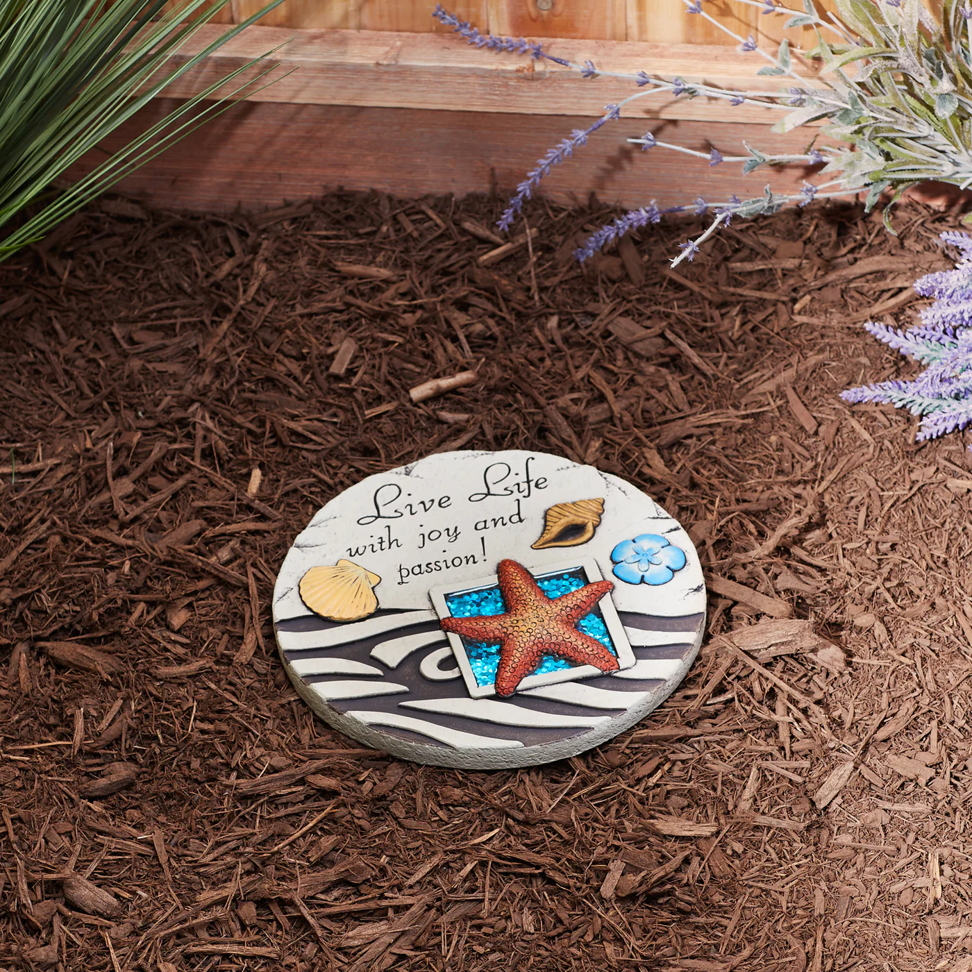 • Bring the beach home to your yard! Turn your garden into a place of gathering with this warm and inviting welcome stepping stone. The glitter overlay makes the starfish pop and emits a subtle sparkle in the sunlight.